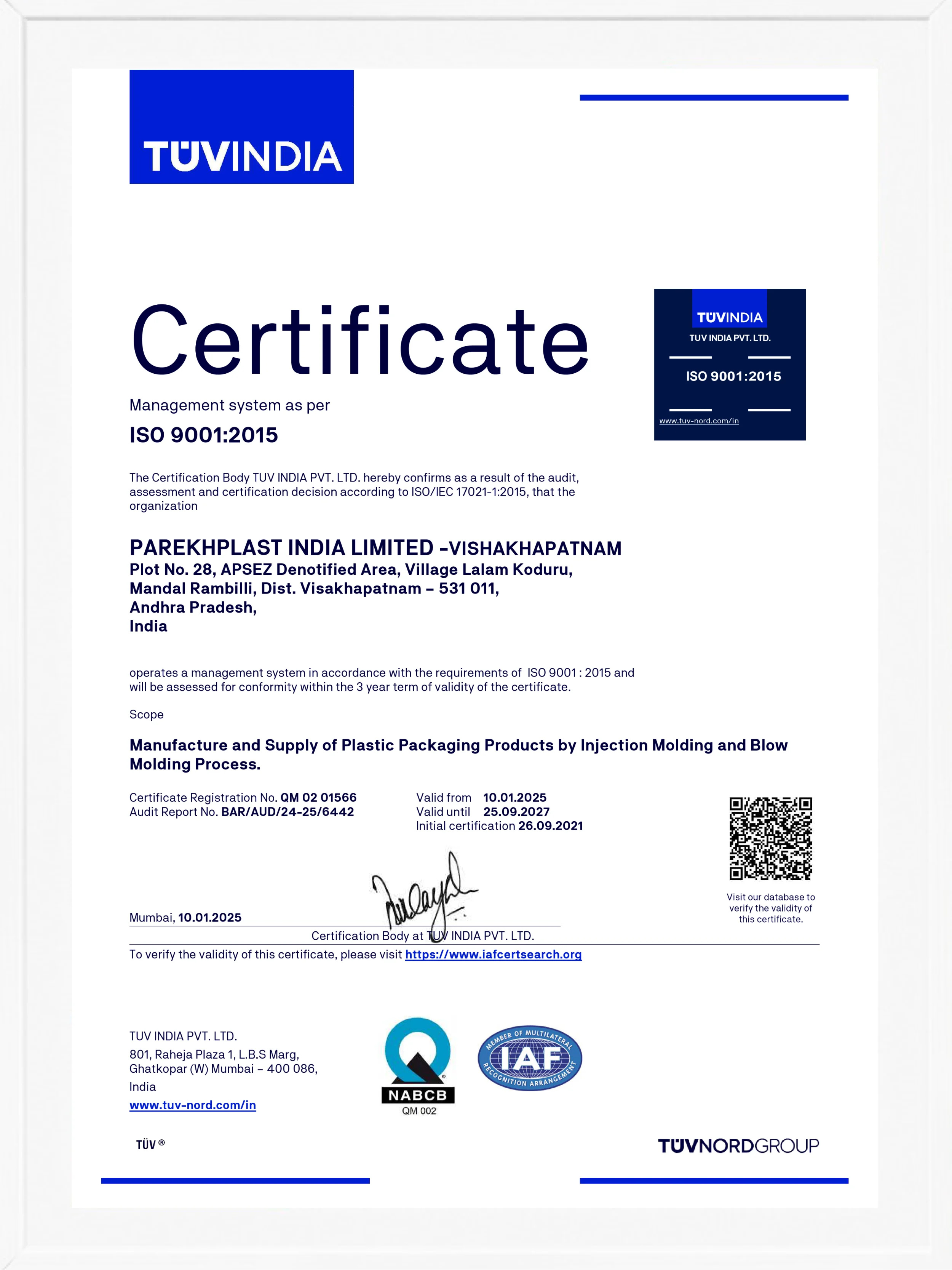 Parekhplast is a highly quality conscious company having a clean room (Class 100000) facility as well as ISO 9001 - 2015, FSSC 22000 and CGMP certification. Parekhplast has also received the Type III DMF (USA) certification which makes it capable to supply packaging material to the pharmaceutical industry especially for the highly regulated USA drug market. Parekhplast prides itself in complying with various European Union or EU/EC norms for plastic packaging materials that come in contact with food.
